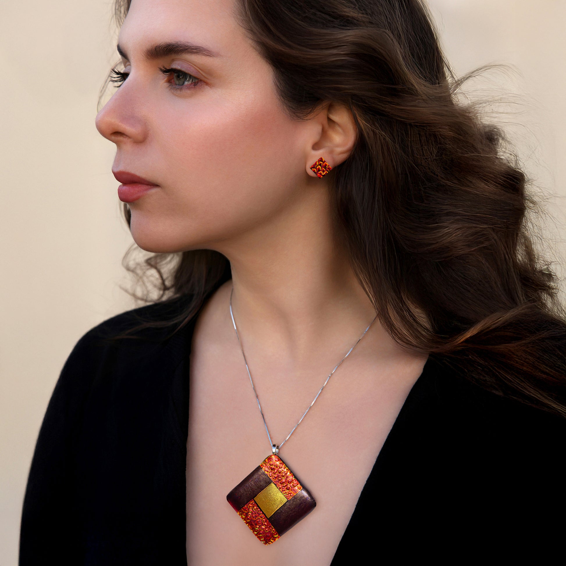 Red and gold diamond-shaped pendant handcrafted in London by glass artist Madiha Zaidi using shimmering dichroic glass inspired by the element of Fire.