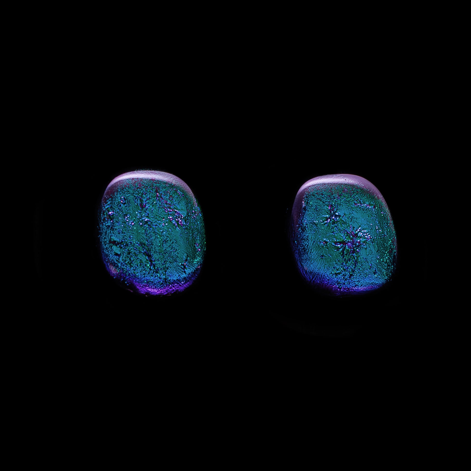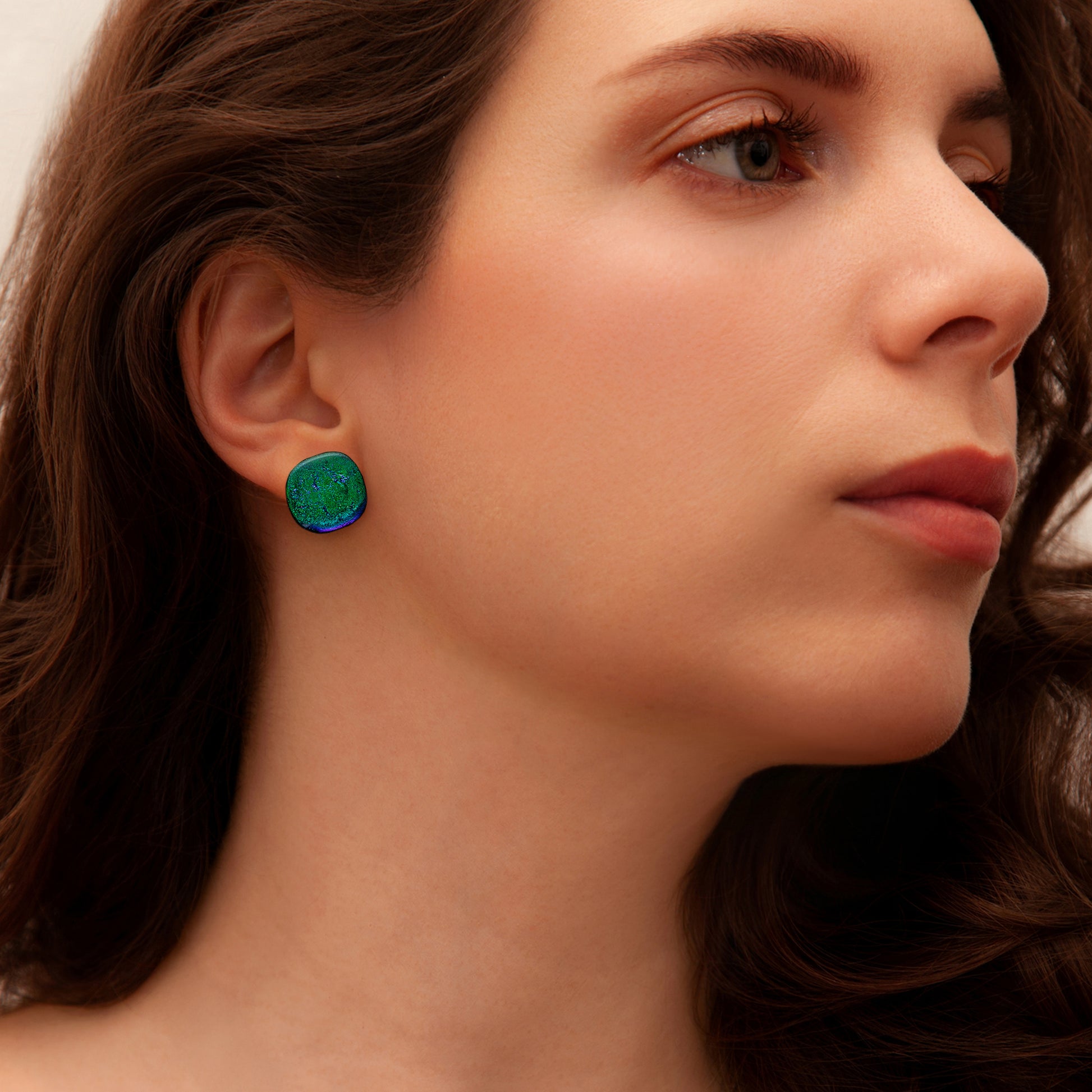 Celebrate the beauty of the May birthstone with our XL Luna May Stud Earrings, handcrafted in London by glass artist Madiha Zaidi. These elegant dichroic glass earrings feature round cabochons encased in a clear glass cap, enhancing their vibrant depth and mesmerising colour shifts. Inspired by the iridescent hues of emerald, these lightweight and comfortable studs reflect light beautifully, creating a radiant cosmic glow.