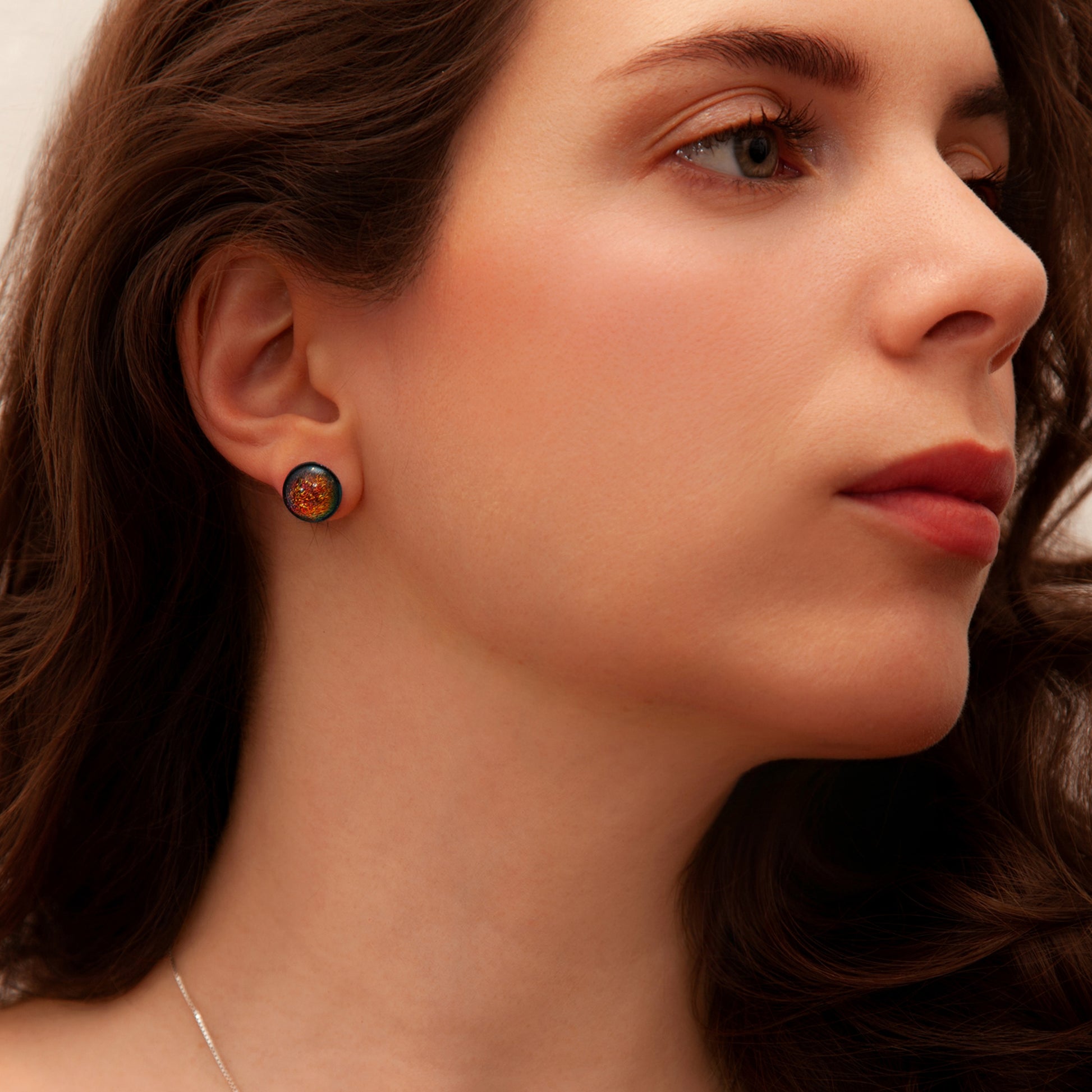 Celebrate the beauty of the November birthstone with our Luna November Stud Earrings, handcrafted in London by glass artist Madiha Zaidi. These elegant dichroic glass earrings feature round cabochons encased in a clear glass cap, enhancing their vibrant depth and mesmerising colour shifts. Inspired by the iridescent hues of citrine, these lightweight and comfortable studs reflect light beautifully, creating a radiant cosmic glow.